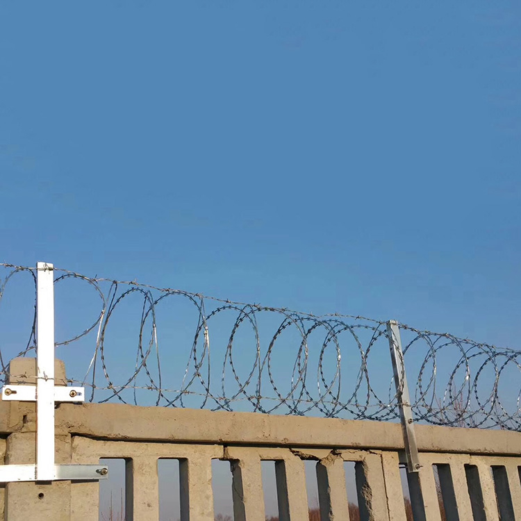 高鐵刺絲滾籠設(shè)置安裝規(guī)范:高鐵刺絲滾籠采用刀片刺繩繞圈后相臨兩圈每隔120°用刺絲連接卡固定,張開后形成蛇腹網(wǎng)狀,閉合后刀片刺繩圈徑為50cm,張開后每交叉圈安裝間距20cm,直徑不小于45cm。鐵路刺絲滾籠由刺絲連接卡扣與固定在支架上的縱向拉筋相連接,縱向拉筋與支架的連接采用o2.5mm的冷拔鍍鋅鋼絲繞2圈后檸緊固定,支架設(shè)置在跨度3m防護(hù)柳欄的立柱和跨中位置,其他跨度僅設(shè)置與立柱上部,支架與防護(hù)柵欄采用支架抱箍連接。鐵路刺絲滾籠刀片刺繩由沖切鋼板采用機(jī)械壓軋?jiān)阡摻z上成型,刀刺寬度22mm,兩刃垂直間距15mm,刀刺縱向間距34m芯絲直徑為2.5mm。刀片采用厚度0.5mm的Q195鋼板沖切制作,芯絲由HPB30006.5mm高線鋼絲加工。