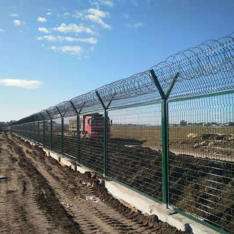 機場Y型護欄網隨著現在生活節奏的加快,生活水平的提高,人們在出差或者游玩時,會選擇乘坐飛機,那么飛行區就要保證沒有非工作人員和小動物誤入跑道,對飛機的起飛與降落造成危險。為此機場四周會安裝機場護欄網, 又稱作“Y型安全防御護網”,機場隔離網、機場圍界網是由V型支架立柱,加強型焊接網片,安全防盜連接件和熱鍍鋅刀片刺繩組成的安全防御性級別很高的護欄網。具有安全性高、防攀爬能力好,網片連接方式采用特制SBS緊扣件,有效防止人為的破壞性拆卸。如果在機場Y型護欄網頂部加裝刀片刺絲、刀片刺網后又很好的增強了安全防護性能。采用電鍍、熱鍍、噴塑、浸塑等防腐形式,具有很好的、抗曬、耐腐蝕等特 點。其產品造型美觀、花色多樣,既起到圍欄作用,又起到美化作用。