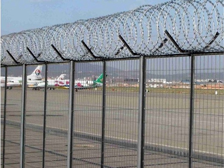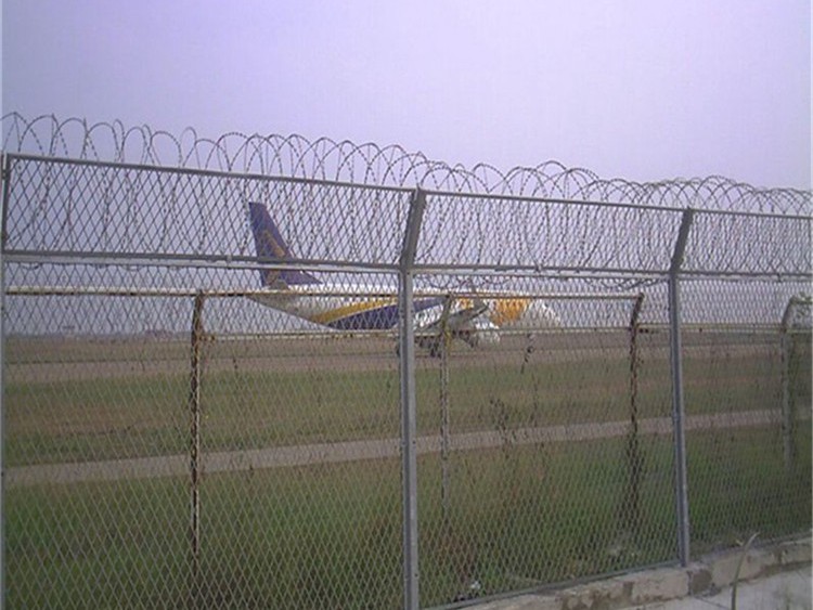 機場圍界網的要求國家標準在機場護欄網頂部安裝刀片刺籠,很好的增加了安全防護性能,由V形支柱、焊接網和緊固件組成,不易變形。具有安全性高、防攀爬能力強、造型美觀、花色多樣抗老化、抗曬、耐候等特點,既起到圍欄防護作用,又起到美化作用。