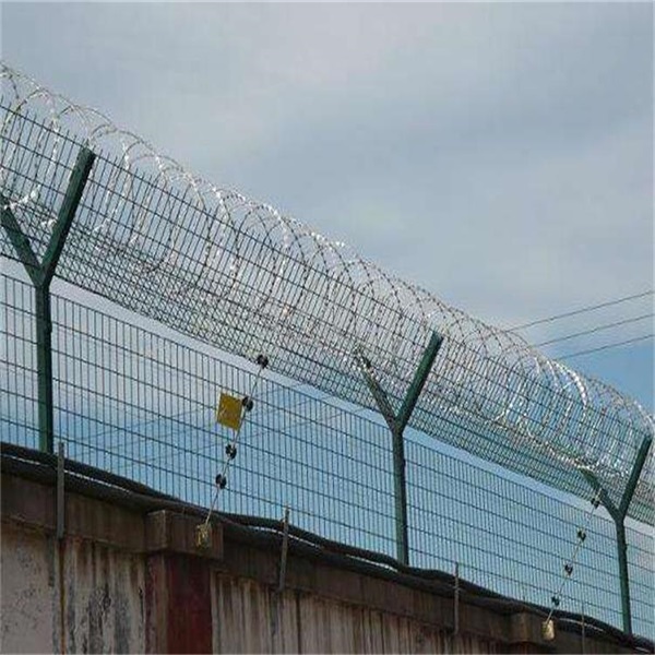 監獄Y型安全防御鋼網墻特殊性,Y型立柱鋼網墻主要采用高強度鋼絲網片與蛇覆式刀片刺網和防盜連接件組合而成,防腐形式有電鍍、熱鍍、噴塑、浸塑。監獄Y型防護網產品特點:立柱采用60*60方管,壁厚2.0mm,焊接成Y型,表面浸塑處理,網片高度2000mm-3000mm,長度2500mm-3000mm,,V型頂端安裝刀片刺網,直徑采用50cm-60cm。