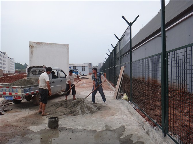 監(jiān)獄防護(hù)網(wǎng)通常采用鋼絲直徑為5mm、6mm、6.5mm,網(wǎng)孔采用50mm×100mm、50mm×50mm、50mm×200mm、50mm×150mm,組成結(jié)構(gòu):首先把網(wǎng)片焊接在鐵管框架上,框架是方管或者圓管焊接成的框架結(jié)構(gòu),在框架上焊接用于個(gè)立柱連接的連接板,用防盜螺栓與立柱連接。為了保證網(wǎng)片的防拆卸性能,網(wǎng)片連接方式采用特制防盜緊扣件,有效防止人為的破壞性拆卸。
