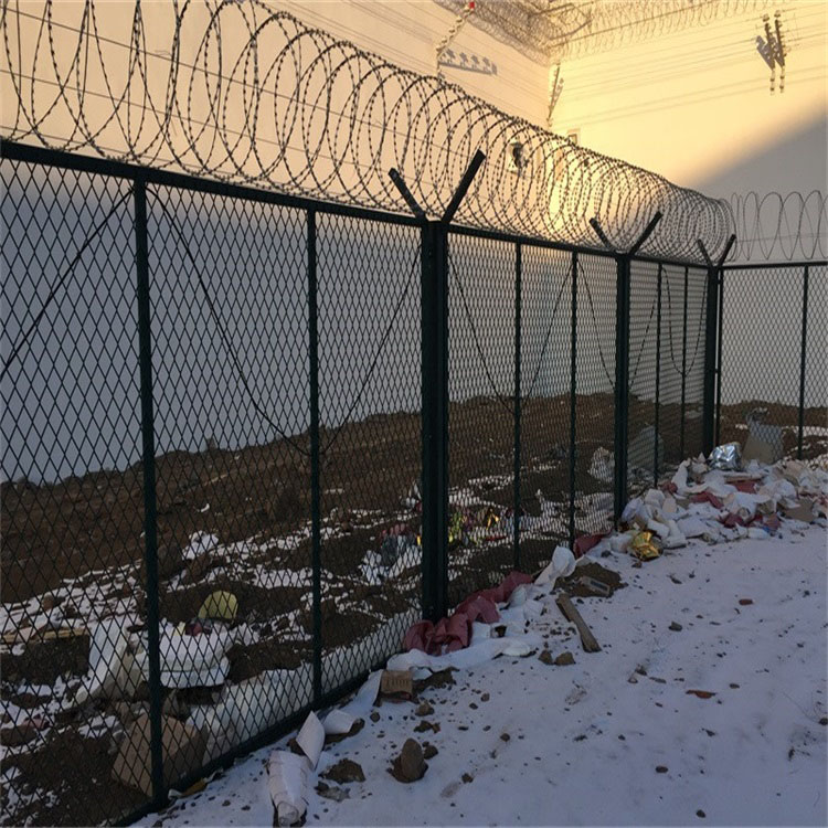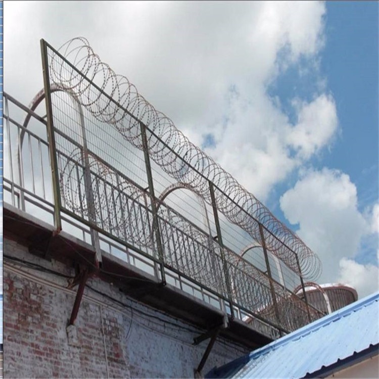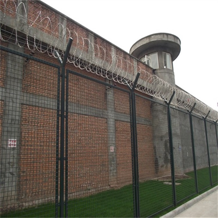 監獄防逃脫隔離網采用高強度的刀片刺網與普通防護網的結合,由V型支架立拄,加強型焊接片網,安全防盜連接件和組成。監獄護欄網監獄刀片鋼網墻網格結構簡練、便于運輸、安裝不受地形起伏限制,特別是對于山地、坡地、多彎地帶適應性強。